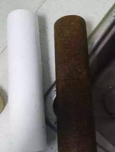 更换的净水器滤芯,白色的滤芯变成这样